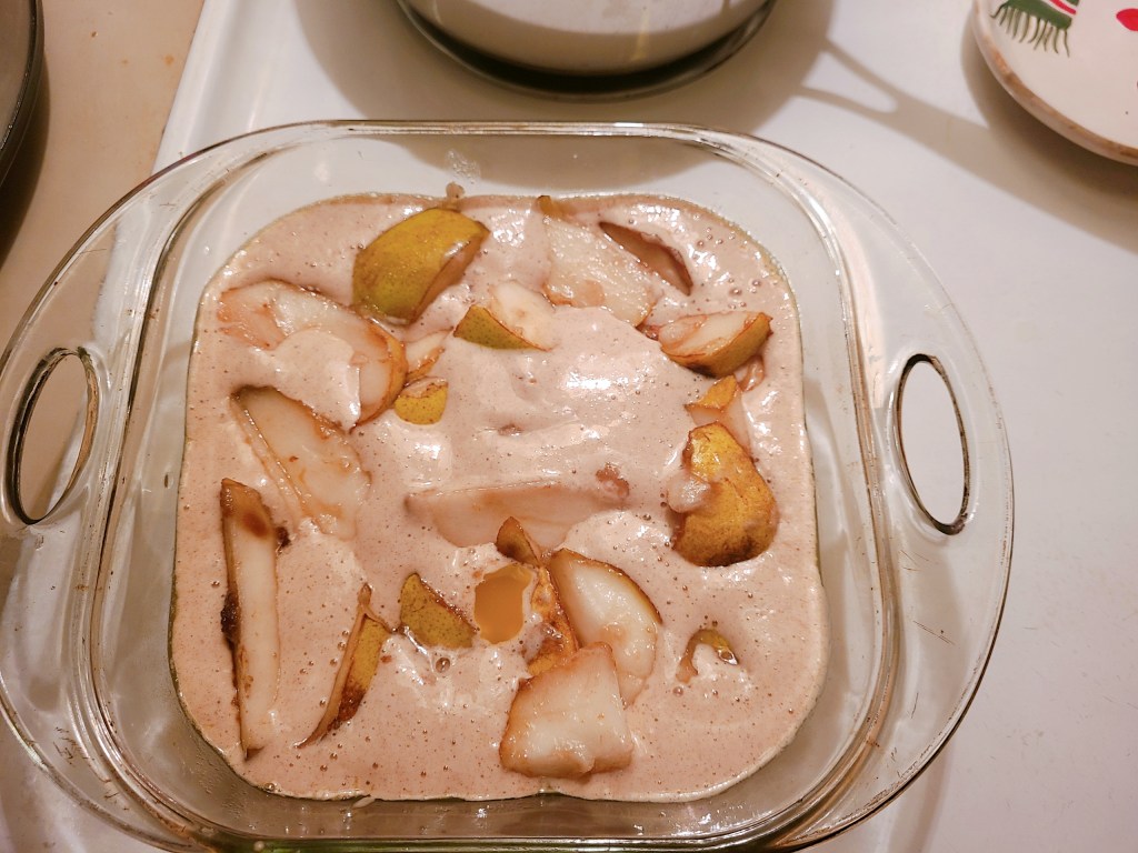 This past Christmas season (to my surprise) I received a box of pears from a family friend. I thought about just taking one pear per day to work for lunch, which I did do once, but ultimately I decided that I wanted to make something with these pears. I typed into Google, ” what dessert can I make with pears?” A plethora of options came up like “pear cake”, “pear tarts,” and “pear pie.” Ultimately, I decided on pear cobbler and I found this recipe from the SpruceEats.com. During the process of creating pear cobbler I substituted and took out some ingredients. Instead of plain white sugar, I used brown sugar, and I reduced the amount of sugar used. On the recipe ingredient list it says to use 1 1/2 cups of sugar, I used two tablespoons of brown sugar. Instead of 8 tablespoons of unsalted sugar, I used 4 tablespoons of buttery spread. I eliminated salt from this recipe. In addition, I also used fewer pears in this pear cobbler. The recipe list wanted me to use 3 to 4 cups of pears. Down below is a picture of the pear cobbler before it was cooked, but had all the ingredients in it.